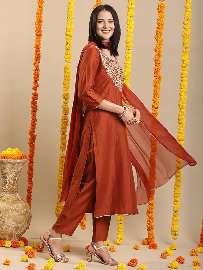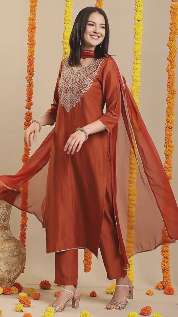 New Women's Rayon Viscose Embroidered Straight 3Pc Kurta Set
