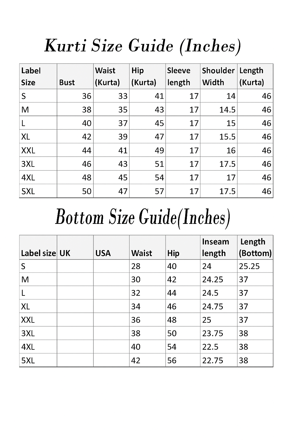 Kurta – S: 36 in, M: 38 in, L: 40 in, XL: 42 in, XXL: 44 in